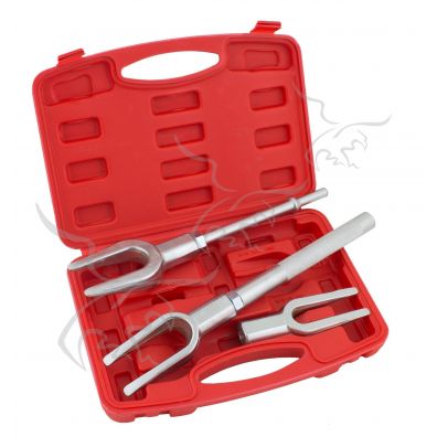 Iva incl.Conjunto de 5 peças para a extração de rótulas com sistema de garfo. Permite desmontar facilmente as referidas peças evitando danificá-las. Os braços possuem uma porca ajustável para absorver choques e proteger os braços e a rosca dos garfos.